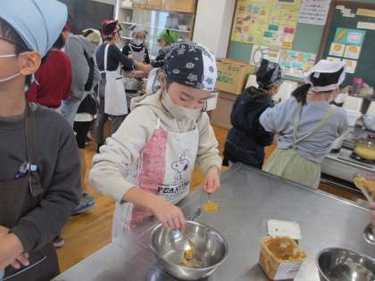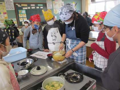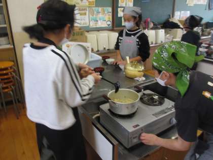 みそ汁づくりも順調に進みました。具材が柔らかくなったら、最後にみそを溶かし入れて完成です。炊き立てのごはんのよいにおいと、みそしるの香りが家庭科室いっぱいに広がりました。