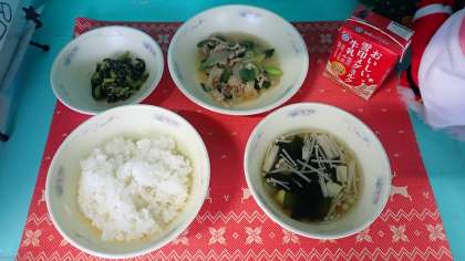 今日は、ごはんに乗せて一緒に食べる白みそ味の「豚丼」です。白みその「あま味」や「香り」を感じられ、豚肉によく合う味付けです。青ねぎの食感もよく、ごはんと一緒においしくいただきました。「すまし汁」は、透明で透き通っており、出汁のうまみをあじわって、おいしくいただきました。