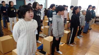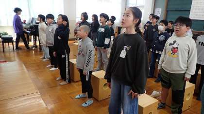 「キリマンジャロ」の合奏のあとで、授業の後半では歌唱教材の「夢の世界を」を歌いました。気持ちのよい響きを味わって二部合唱するために、合唱部分の初めの音をロングトーンで伸ばして和音のひびきを確かめました。