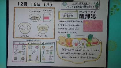 「酸辣湯(サンラータン)」は、中国料理の一つです。肉や野菜などを入れ、酢の酸味ととうがらしやこしょうのから味と香りをきかせたスープです。給食では、鶏肉、玉ねぎ、ニラ、卵などを入れ、酸味には米酢、から味にはこしょうを使っています。最後に、ごま油、酢を入れて香りよく仕上げています。卵が入ることで酸味もやわらかく食べやすくなり、味わっておいしくいただきました。