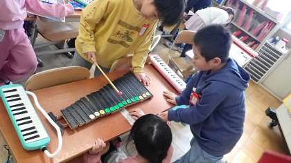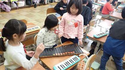 卓上木琴を使って、「きらきらぼし」を演奏しました。鍵盤ハーモニカとずいぶん見た目が違う木琴ですが、鍵盤の並びは同じです。「ド・ド・ソ・ソ・ラ・ラ・ソ…」と階名唱をしながら、マレットを使って演奏をしました。