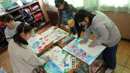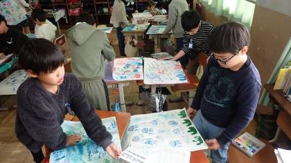 これまでに一生懸命がんばってきた作品が、いよいよ完成します。「これは何を使って版をつくったの?」と聞くと、素材やつくったときの工夫をどんどん話してくれました。思いのいっぱい詰まった個性豊かな作品ができあがりました。