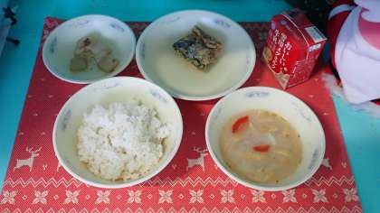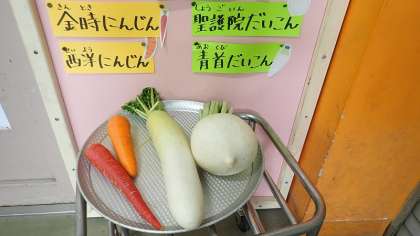 「京野菜のみそ汁」は、京野菜が使われた白みその京風みそ汁です。今日の給食には、あざやかな赤色で、やわらかく甘みのある「金時にんじん」と、やわらかくて煮ものによく使われる大きく丸い形の「聖護院だいこん」が使われていました。寒い日にも体が温まるみそ汁で、みずみずしい京野菜を味わいながら、おいしくいただきました。