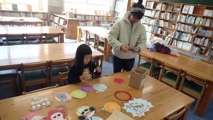 今日は、「うめのこ」さんが来て、学校図書館の「ほんのもり」に1月の飾りつけをしてくださいました。