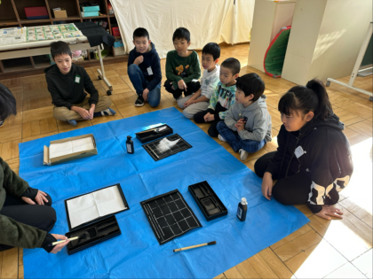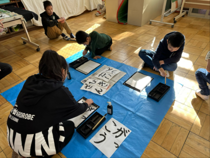 冬休み明けも変わらず、元気な姿が見られて嬉しかったです。書き初めでは、今年一年、頑張りたいことを一言で書きました。初めて毛筆をする友達もいたので、先生の説明を聞いてから取り組みました。何を書いたのか、またお家で聞いてみてくださいね。