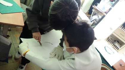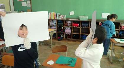 工作用紙を顔の形にくり抜き、できた穴から顔を出すと、観光地などで見かける「顔出しパネル」のようになりました。無地の工作用紙から顔を出すだけでも楽しそうですが、ここに絵をかくと、もっと素敵な作品になりそうです。どんな作品になるのか楽しみです。