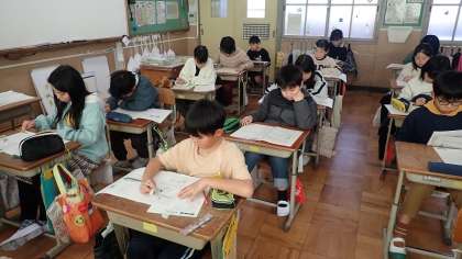 みんな、真剣な面持ちで確認テストに取り組んでいます。普段の単元テストとは出題範囲や問題数が違うので、時間配分を気にしながらがんばりました。