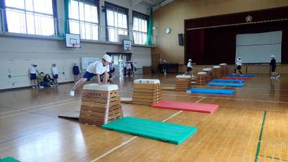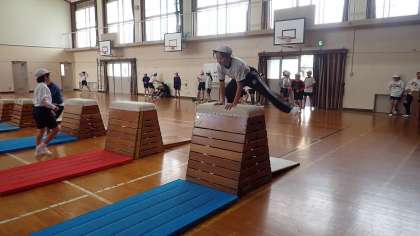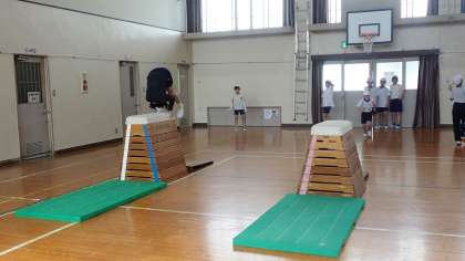 今日から単元の学習が始まりました。4年生で学習をしてから1年が経ちましたが、跳ぶ時のポイントを思い出しながら、できる跳び方で高さに挑戦しました。開脚とび、かかえこみ跳びだけでなく、台上前転に挑戦している子もいました。