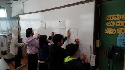 明日から始まるジョイントプログラムの確認テストに向けて、これまでの復習をしました。プリントができたら、ホワイトボードに掲示してある回答を見て自分でまるつけをしています。どの教科でも、学習の成果をしっかり発揮してくださいね!