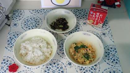 「あげたま煮」は、たまねぎ、にんじんの甘みがよく出ており、油あげとたまごの取り合わせが子どもたちに人気の献立です。「みつば」が入っているので香りがよく、みつばの苦みが他の食材の甘みを一層引き立てていました。