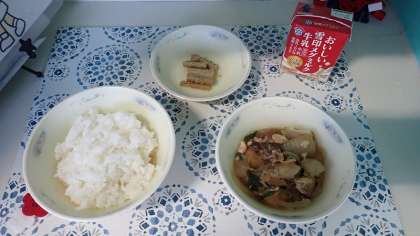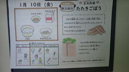 「すきやき風煮」は、牛肉、焼きどうふ、たまねぎ、九条ねぎ、糸こんにゃくなどすきやきの具材がたくさん入っています。ごはんとの相性がぴったりの献立で、いつも以上にごはんが進みました。「たたきごぼう」は、ごぼうを細長く切ってゆで、ごま酢や甘酢で味をつけたものです。味がしみこみやすいようにたたいて繊維をほぐすことから、「たたきごぼう」と呼ばれます。さっぱりした酢の味をたのしんでおいしくいただきました。