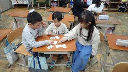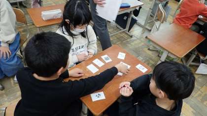 今日は、たくさんの動物の名前の英語での言い方を知りました。“dog”や“bear”など、子どもたちがよく知っているものもありますが、なじみのない動物もたくさんいます。今日は、「カルタゲーム」や「集中力ゲーム」を通して、英語での呼び方に慣れ親しみました。