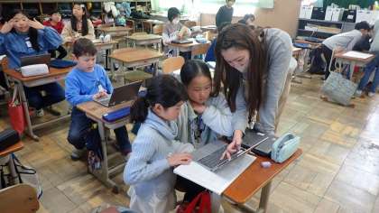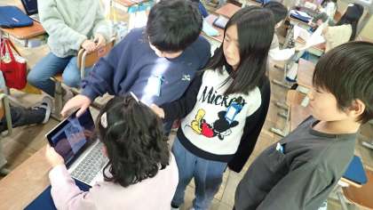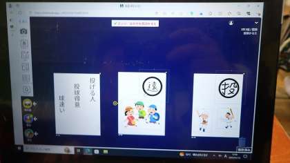 1つの漢字の「音読み」と「訓読み」の両方の読み方を使って、かるたづくりに取り組みました。かるたは、GIGA端末のアプリ「ロイロノートスクール」を使って作っています。先生のお手本を参考にしながら、とても上手に作っていました。