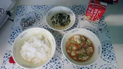 「五目どうふ」には、豆腐の他にもたくさんの具が入っています。ほどよくしょうがが効いており、豆腐と豚肉、たまねぎ、にんじん、えだ豆などをいっしょにおいしくいただきました。「ほうれん草ともやしの炒めナムル」は、ちょうどよい酸味がおいしいい献立です。もやしのシャキシャキした食感を楽しんでいただきました。