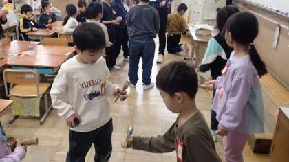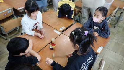 けん玉やお手玉、だるま落とし、おはじきなど、昔から遊ばれてきたお正月や冬の遊びをして楽しみました。児童館に行っている子どもたちは、けん玉が大好きでとても上手です。友達にコツを教えながら、一緒に楽しんでいました。
