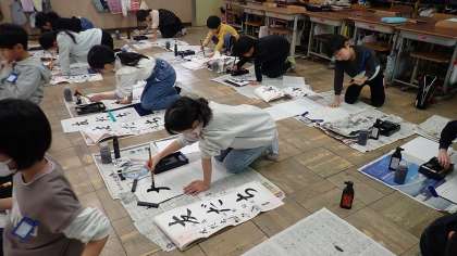 書いているのは「友だち」の3字です。いつも使っている半紙ではなく、縦に長い画仙紙に書きました。全体のバランスや文字の大きさに苦労していましたが、お手本を見ながら1画1画ていねいに書いていました。