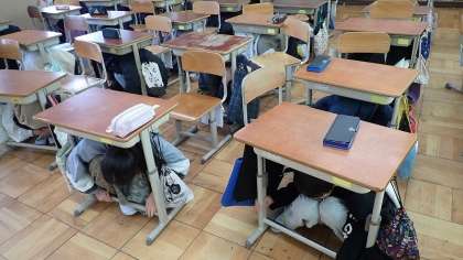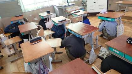 子どもたちには、今週のどこかで行うことまでは予告していましたが、どの時間に起こるかは伏せて実施しました。授業中に、教室のスピーカーから地鳴りの音が鳴り始めると、国府度もたちはすばやくつくえの下にもぐり込み、落下物の危険から身を守る1次避難を行いました。