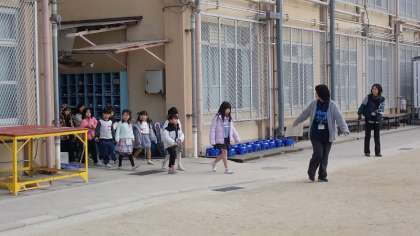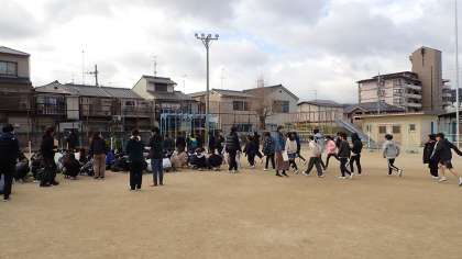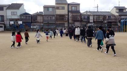 子どもたちも、真剣な表情で運動場へ避難をしました。訓練のときは災害が発生した時のように真剣にすることが大切です。避難経路を通って、全校児童が運動場に避難することができました。