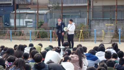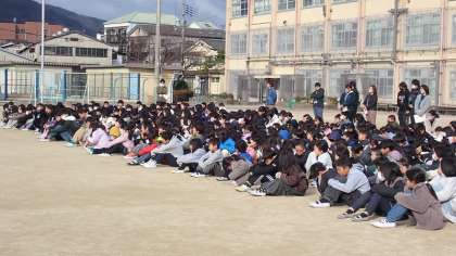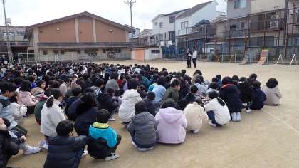 最後に、校長先生からのお話を聞きました。30年前の阪神・淡路大震災のときにも、被災した人々は寒さと不安の中避難されたことや、今日、3分34秒という短時間で落ち着いて避難できたことが大切であることなどをお話しくださいました。しっかり訓練し、万一に備えておくことで、いざという時にも自分の身を守ることができるようになります。ご家庭でも、この機会に万一の避難場所についても話し合ってください。
