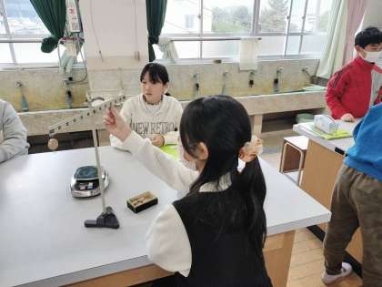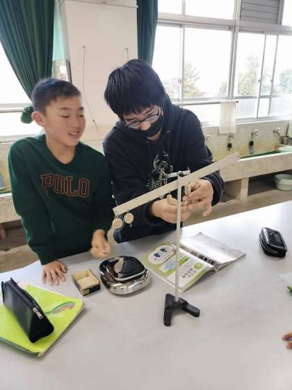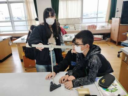 実験用てこを使って、左のうでにおもりを吊るした状態で、右のうでに力を加えてつり合わせる活動をしました。てこの支点に近いところからうでの先の方に力を加えるところを変えていくと、力が小さくて済むことを発見し、違いに驚いていました。