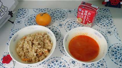 今日は、給食室で保管しておいたアルファ化米や缶詰などの食材を使って、給食を作りました。「カレーピラフ」は、給食室の大きな釜で炊いています。アルファ化米を使用していますが、ごはんがもちもちしていておいしくいただくことができました。