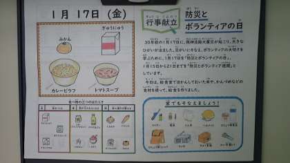 今日の献立は、「防災とボランティアの日」に合わせた行事献立です。30年前の今日発生した「阪神淡路大震災」をきっかけとして、災害に備え、ボランティアの大切さを学ぶために設けられた日です。