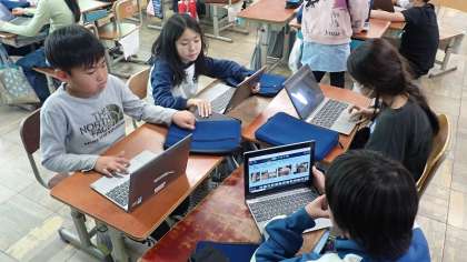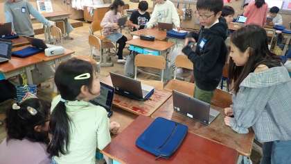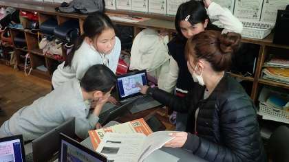 今週の金曜日に、保護者の方に見に来ていただいて学習の成果を発表する「うめづタイム」を実施します。本番に向けて、グループの友達と最後の仕上げに取り組んでいます。