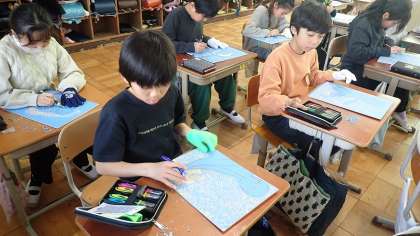 4年生は、図工の「ほってすって見つけて」の作品づくりをしています。