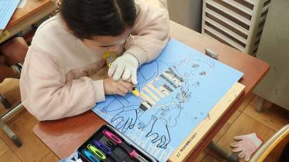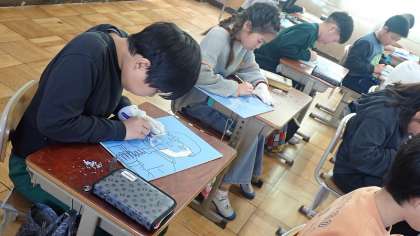 彫刻刀の使い方にも慣れ、ていねいに彫り進めています。線彫りと面彫りで彫り方が違うので、気をつけて彫っています。安全に気をつけて、すてきな作品を仕上げてほしいと思います。