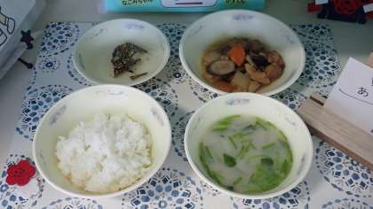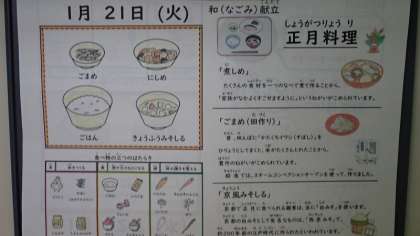 今日は「正月料理」をいただく1月の和献立の日でした。「煮しめ」は、たくさんの食材をひとつの鍋で煮てつくることから「家族が仲良くすごせますように」という願いが、「ごまめ(田作り)」は、昔、田んぼに「カタクチイワシ」を肥料としてまくと米がたくさんとれたことから、豊作の願いが込められている献立です。白みそを使った「京風みそ汁」には、京野菜の金時にんじんが使われており、甘みを味わっておいしくいただきました。