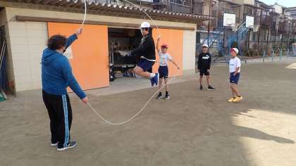 短なわとびでいろいろな跳び方で跳んだり、大縄で回数に挑戦したり、大縄の中で短なわとびに挑戦したりと、いろいろななわとびに取り組みました。また、2本の縄を使う「ダブルダッチ」に挑戦する子どもたちもいました。