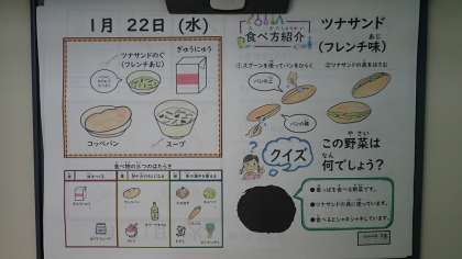今日は、自分で具材をコッペパンにはさんで作る「ツナサンド」の日です。ツナやたまねぎキャベツなどの具をパンにはさんで食べました。ほんのり酸味のあるフレンチ風の味付けで、具材のおいしさがよく引き立っていました。