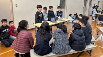 発表を終えたグループの子どもたちに「しっかり伝えられた?」と聞くと、「はい!」と満足そうな返事が返ってきました。「でも、もう少し声をはっきり聞こえるようにしたらいいってアドバイスしてもらった。」と、よりよい発表にしていくために大切にしたいことも考えていました。