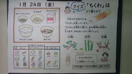 「かきあげ」は、子どもたちの好きな揚げ物献立です。ちくわ、たまねぎ、三度豆、にんじんが小麦粉・かたくり粉の衣でさくっと揚がっています。食材の甘みがよく出ていて、食感を楽しみながらおいしくいただきました。「赤だし」は,信州みそと八丁みそで作られています。みその味わいが深い赤だしをおいしくいただきました。