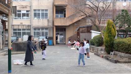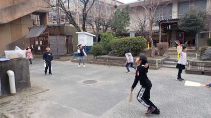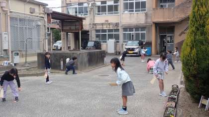 もう一つの「はねつき」は、なかなかうまくいきません。小さな羽子板で羽をうまくはじくのは、1年生の子どもたちにとってはとても難しかったようです。1回、2回、3回…と続くと歓声が上がっていました。
