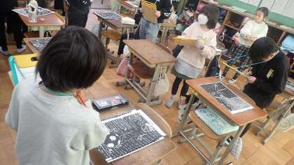 4年生は、図工の「ほってすって見つけて」の学習をしています。
