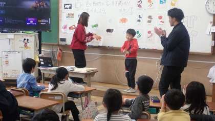 今日は、「スターゲーム」をして、動物の名前と色の英語での言い方に慣れ親しみました。「スターゲーム」は、ホワイトボードに掲示されたカードの下に隠されたスターを見付けるゲームです。カードをめくるためには、めくりたいカードを英語で言わなければならないので、自然に単語を覚えられるようになります。スターが出ても出なくても、みんなで盛り上がって楽しんでいました。