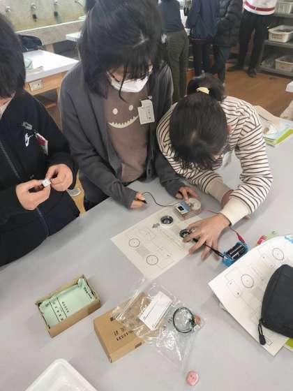 電磁石にも磁石のように「極」があるのか、また、極を変えることができるのかを方位磁針を使って実験しました。回路に電流を流すと、方位磁針の指す方向が変わり、極が入れ替わることに驚いていました。