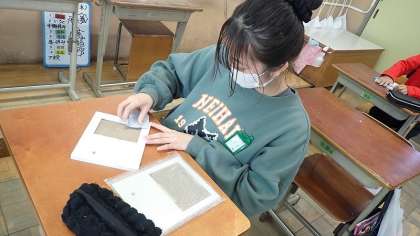 6年生が作っているのは、「オルゴール付きのフォトスタンド」です。小学校生活6年間の思い出にふさわしいものになるようにデザインを考え、彫り進めています。彫りの作業が終わったら、次は彩色です。できあがった作品は、2月18日〜20日の作品展で展示します。ぜひご覧ください。