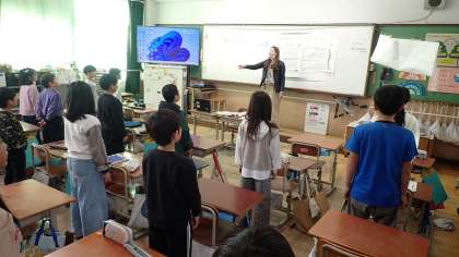 先週の金曜日の学習を思い出しながら、歌声の響きに気をつけて歌っていました。歌っているときの表情がとてもよく、「よい歌」に欠かせない「よい顔」がばっちりです。これからも、歌を贈る相手のことを考えて練習してほしいと思います。