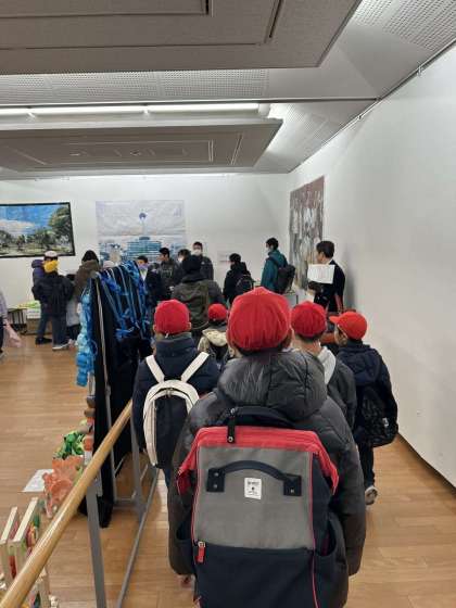 1階には、中学校の作品が展示されており、兄弟や卒業生の名前を探しながら鑑賞をしました。その後、芝生で休憩をすることになり、おにごっこやかくれんぼなど体を思う存分動かしていました。