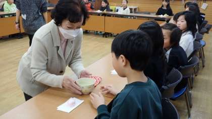地域の和菓子屋さんにご用意いただいたお菓子をいただいてから、女性会のみなさまに点てていただいたお茶をいただきました。初めてお抹茶をいただく子がほとんどで、ちょっと緊張しながらもいただきました。