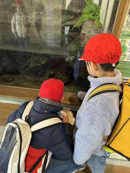 昼食後は、園内を回りました。「ぼくはバクが見たい。」「〇〇さんが好きなオオサンショウウオがいるよ。」など楽しく見て回りました。