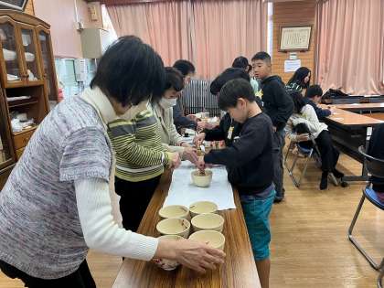 その後、実際にお茶を点てる体験をさせていただきました。たくさんの子どもたちが希望したので少しずつの体験になりましたが、茶筅を使ってお茶を点てる経験ができました。最後に感想やお礼の気持ちを伝えました。