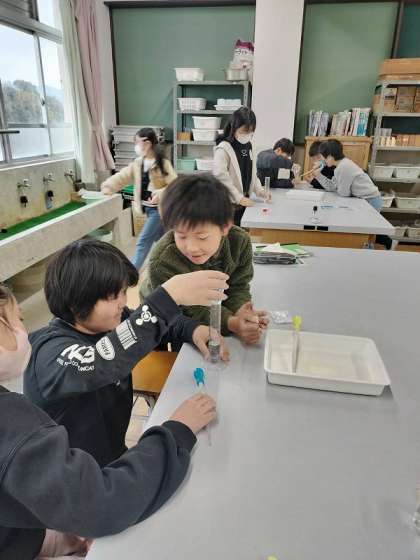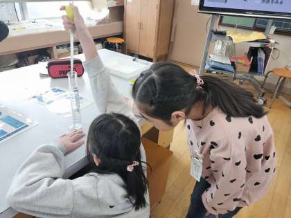 メスシリンダーは、液体の体積を正確に測りとるための実験器具です。目盛りの読み方や、正確なはかりとり方を確かめて、実際に水を正確にはかりとりました。