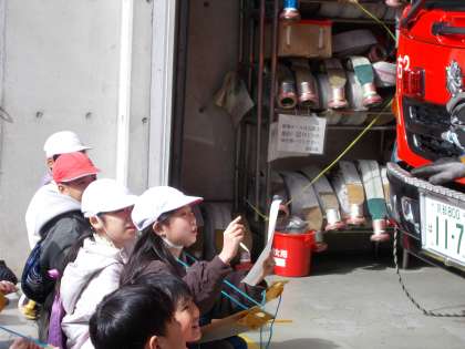 このほかにも、救助の際に活躍するコンクリートや金属をこじ開ける道具や、エンジンカッターなどの資機材を見せていただきました。エンジンカッターは、どのように使用するか、実際に見せていただきました。子どもたちは、教えていただいたことを一生懸命にメモしていました。