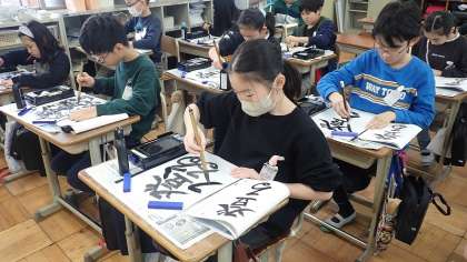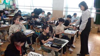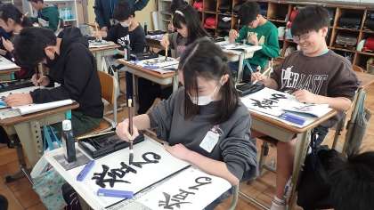 5年生は、毛筆書写の学習をしています。