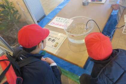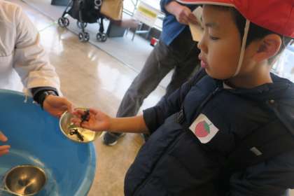 科学センターへ行きました。入口を入ってすぐのところに生き物とのふれあいコーナーがあり、みんなが大好きなウーパールーパーを見たり、ドクターフィッシュやイモリを触ったりしました。