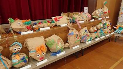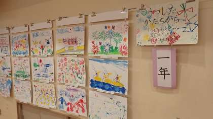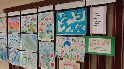 1・3・5年生は平面作品を、2・4・6年生は立体作品を展示しています。むくのき学級は、平面作品と、「小さな巨匠展」でも展示した立体作品を展示しています。