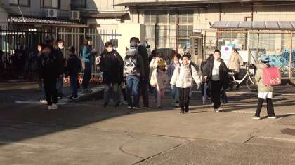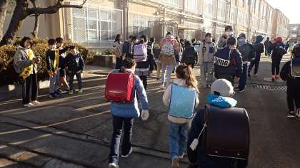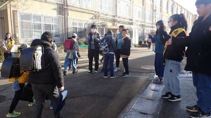 昨日の夜からの冷え込みで、道路には凍結しているところがありました。子どもたちは足元に気をつけて登校しました。構内にも凍っているところがあったので、計画委員会の子どもたちも気をつけてあいさつをがんばりました。